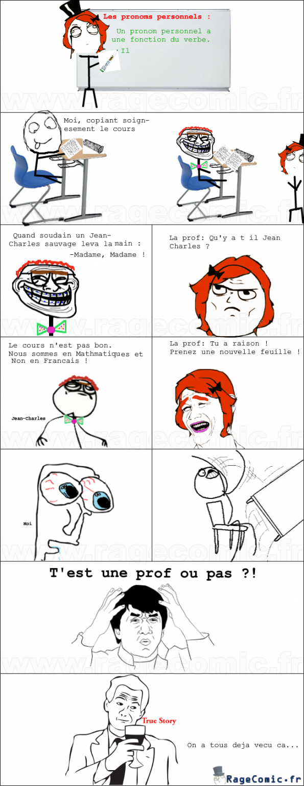 T’est une prof ou pas ?!Le 20 mai 2013 dans My Brain is Full of F**k par Invité · 6 Comments · vu 9 158 foisT'est une prof ou pas ?!, 2.0 out of 5 based on 163 ratings Partager Cet article a été déposé par Killer Of Ragecomic.Tagged with → cours • intello de service • prof • trompe