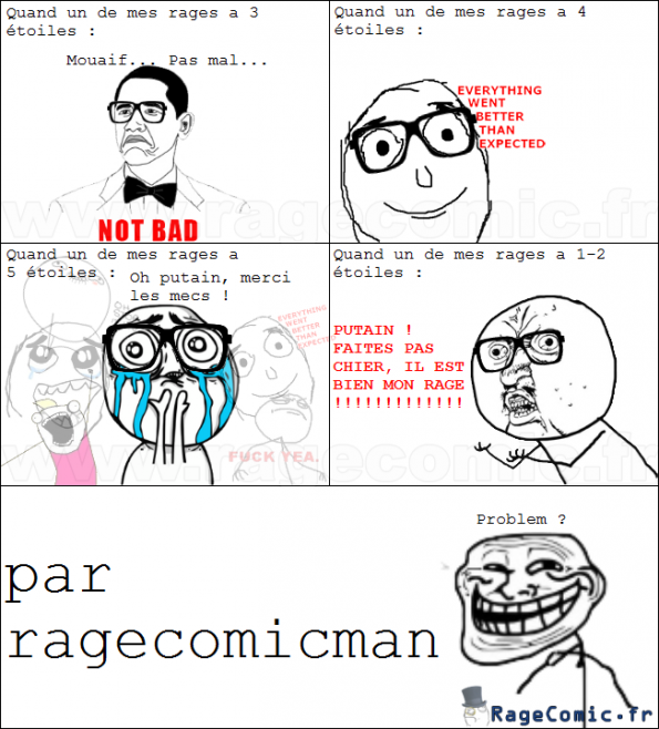 Les notes de mes ragesLe 1 novembre 2015 dans Y U NO par Ragecomicman · Add Comment · vu 216 foisLes notes de mes rages, 3.6 out of 5 based on 108 ratings Partager Cet article a été déposé par Ragecomicman.Tagged with → note • ragecomicman